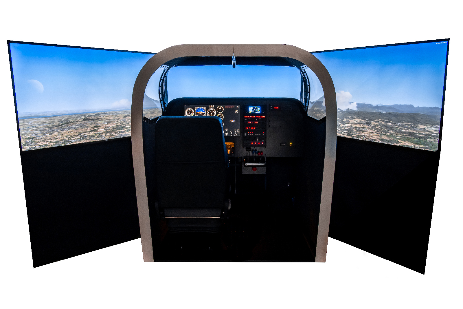 Fibreglass Cockpit, Control Loading Yoke & Pedals, Leather Seat, Digital Avionics, Optional Aircraft Type Instrument Masks.